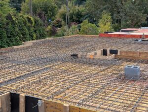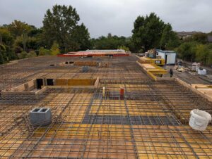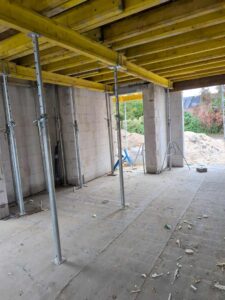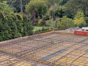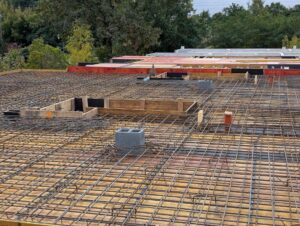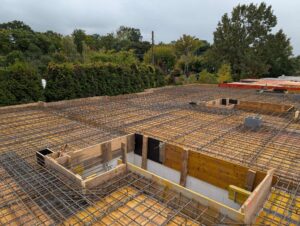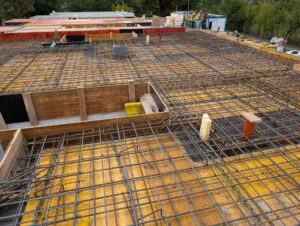 W szeregu B trwają prace nad zbrojeniem i betonowaniem stropu. To kluczowy etap, który zapewnia stabilność konstrukcji i pozwala kontynuować budowę kolejnej kondygnacji.